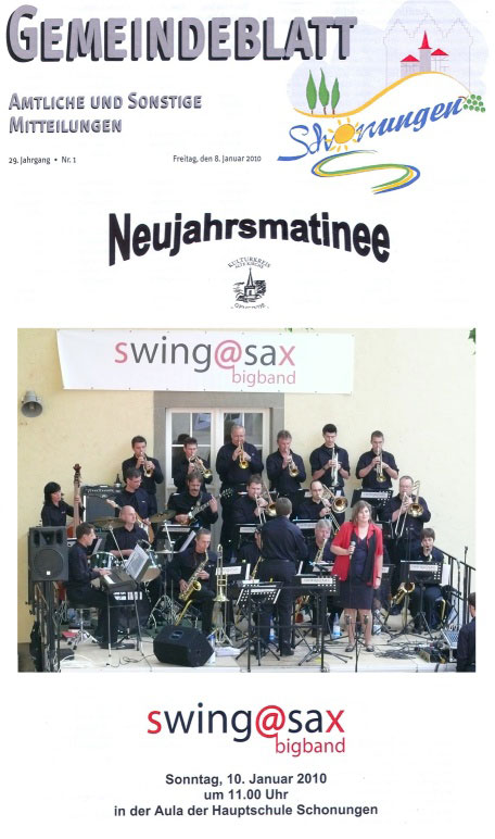 Mit bekannten Swing- und Blues-Melodien hat die swing@sax-Bigband die Gäste der Neujahrsmatinee des Kulturkreises der Gemeinde Schonungen begeistert. Die Bigband besteht aus Mitarbeitern der ZF Sachs AG und ZF Services, die der Spaß an der Musik, besonders am Sound einer Bigband zusammengeführt hat. Für ihre musikalischen Darbietungen unter Leitung von Fabian Usleber bekamen sie eine Menge Applaus. Im Bild Sängerin Victoria Holzmann, die sich mit den Musikstücken Respect, Route 66 und Don't Know Why in die Herzen der Zuhörer sang.