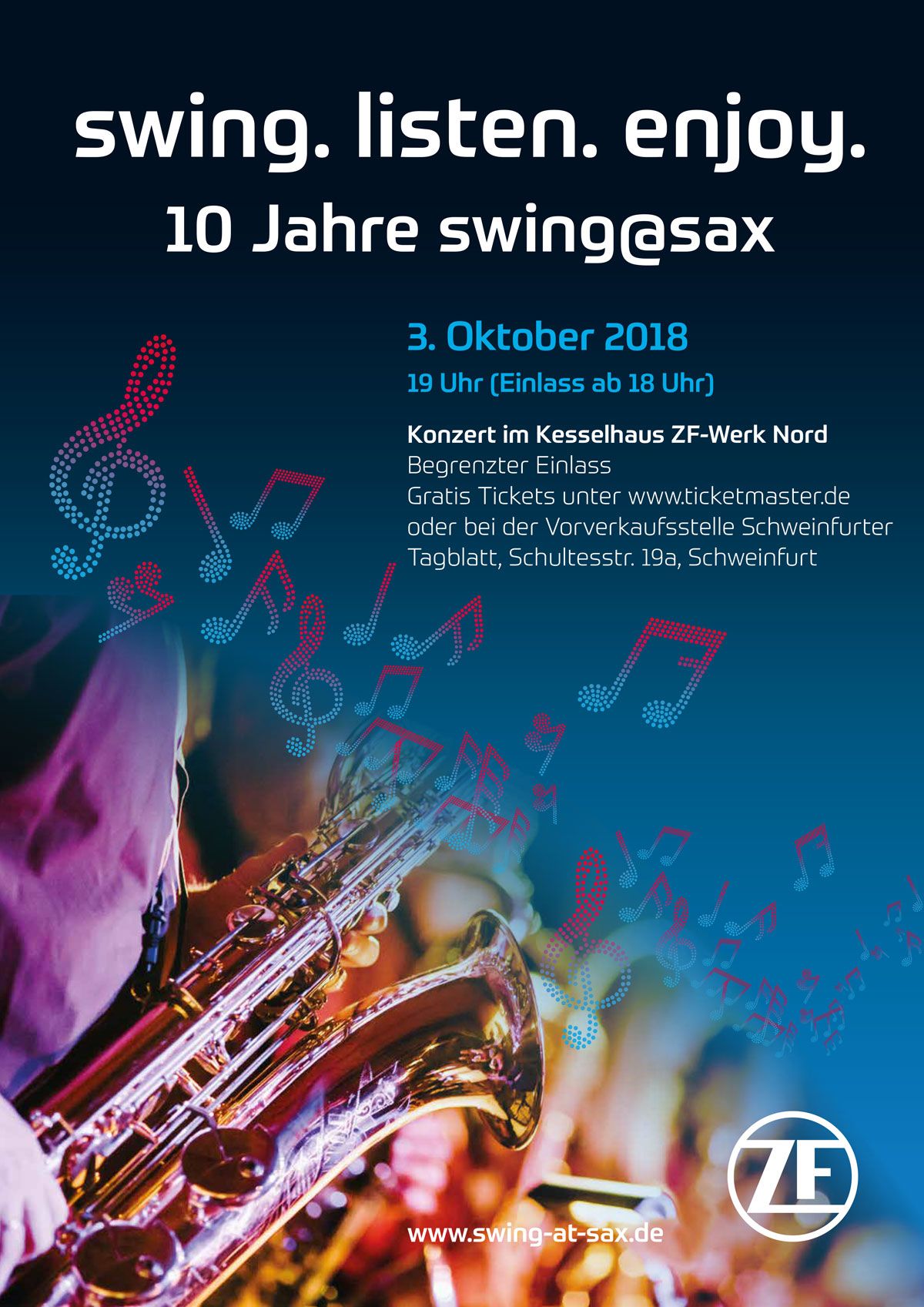Unter dem Motto „swing. listen. enjoy.“ lädt die Big Band swing@sax im Rahmen ihres zehnjährigen Bestehens zu einem Jubiläumskonzert am Mittwoch, 3. Oktober, um 19 Uhr im Kesselhaus auf dem Gelände des ZF-Werks Nord ein. Kostenlose Eintrittskarten für die limitierten Plätze sind ab 3. September, ab 9 Uhr unter www.ticketmaster.de und bei der Vorverkaufsstelle Schweinfurter Tagblatt, Schultesstraße 19a, erhältlich.